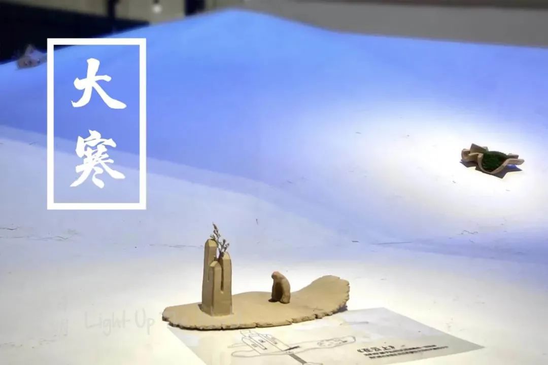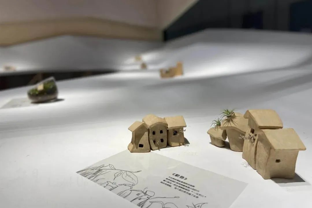 空间装置作品“时光花园”将厚重的材质变得“轻盈”,在空间中流动。室内设置的小房子的坡屋顶与桌面相连,屋顶仿佛从地面生长,蔓延,而桌面上布置的陶泥建筑作品,正待人发现、观摩。